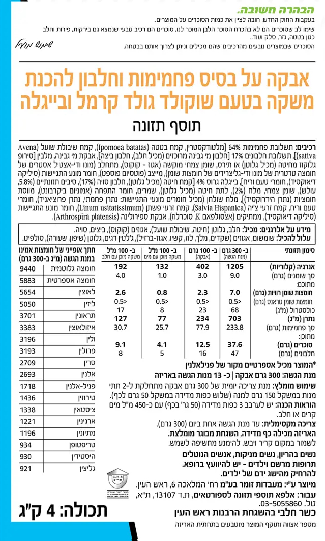 • לערבב 3 כפות מדידה (50 גר' בכל כף) עם 450 מ"ל מים קרים או חלב.