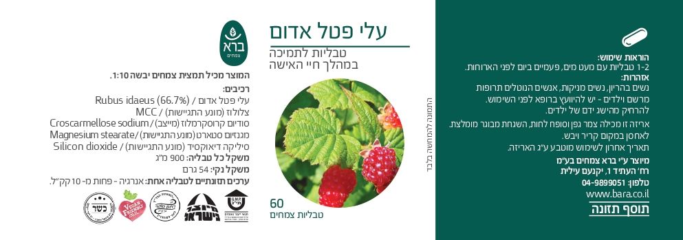 טבליות עלי פטל אדום, מופקות באמצעי מיצוי טבעיים ללא חומרים משמרים, ללא תוספת סוכר או ממתיקים מלאכותיים. מתאים לטבעוניות.