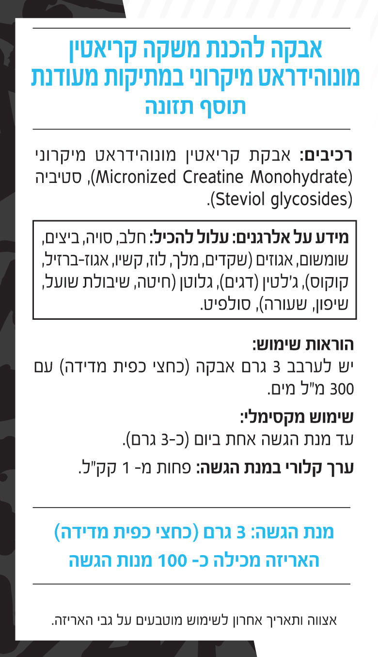 - לפני אימון ערבבו 1/2 כפית מידה (2.5 גרם) עם 300 מ"ל מים או מיץ.