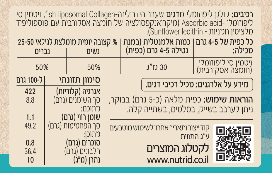 - אבקת קולגן דגים טהור בטכנולוגיה ליפוזומלית שהוכחה מחקרית כבעלת זמינות ביולוגית גדולה פי 1.5 מקולגן רגיל