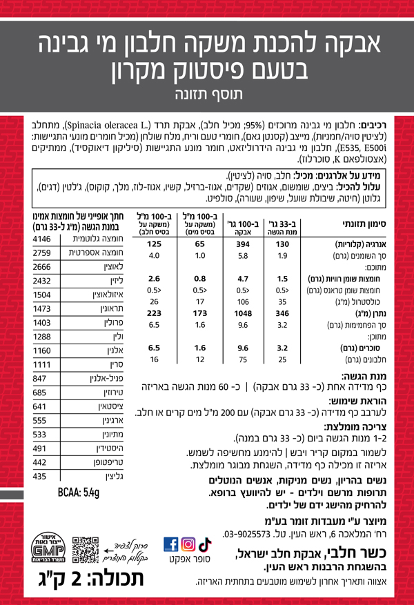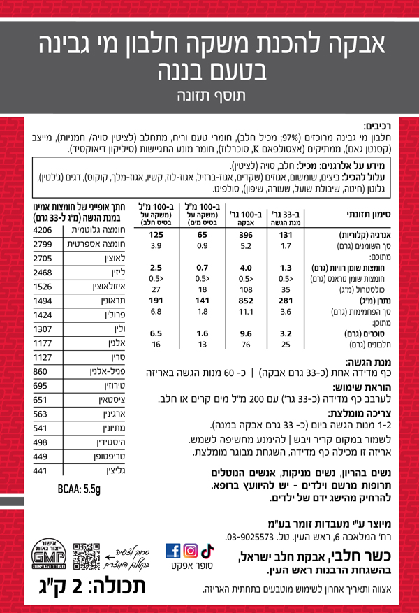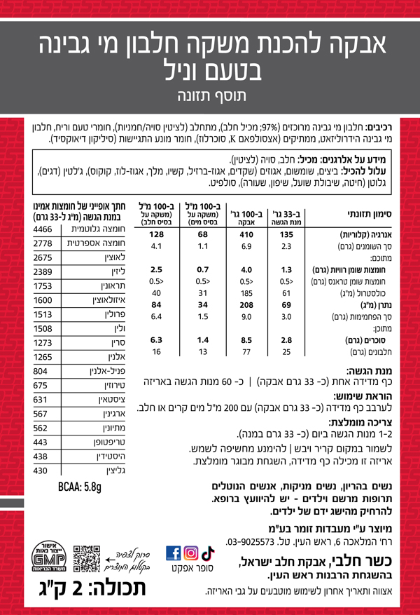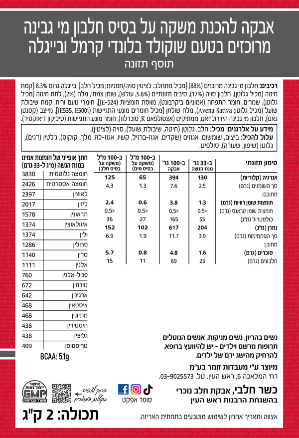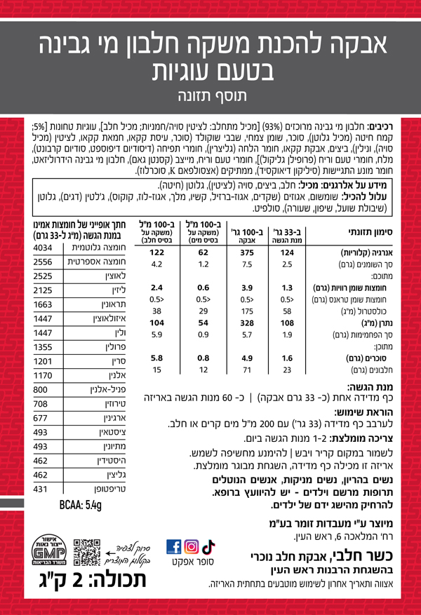 רכיבים: חלבון מי גבינה מרוכז, חומצות אמינו חופשיות, חומרי טעם וריח, צבע מאכל טבעי (טורמריק) וממתיקים מידע אלרגני: מכיל רכיבי חלב.