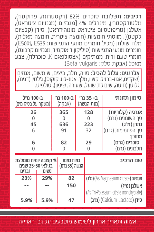 הפורמולה המתקדמת משלבת פחמימות זמינות יחד עם מלחים ומינרלים חיוניים כמו מגנזיום, סידן ואשלגן, במטרה למנוע התייבשות, לעכב עייפות ולהאיץ את ההתאוששות שלכם.