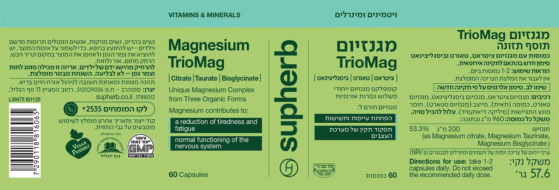 תוסף מגנזיום אשר משלב את שלוש הצורות המובילות: מגנזיום ציטראט, מגנזיום ביסגליצינאט ומגנזיום טאוראט.